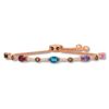 This eye-catching bracelet,eatures a colorful array of gemstones. Ocean Blue Topaz?, Raspberry Rhodolite? Garnet, Grape Amethyst?, Bubblegum Pink Sapphire, and Chocolate Quartz? are interspersed with bezel-set Chocolate Diamonds? totaling 5/8 carat in weight. The colorful bracelet is fashioned in stunning Strawberry Gold.