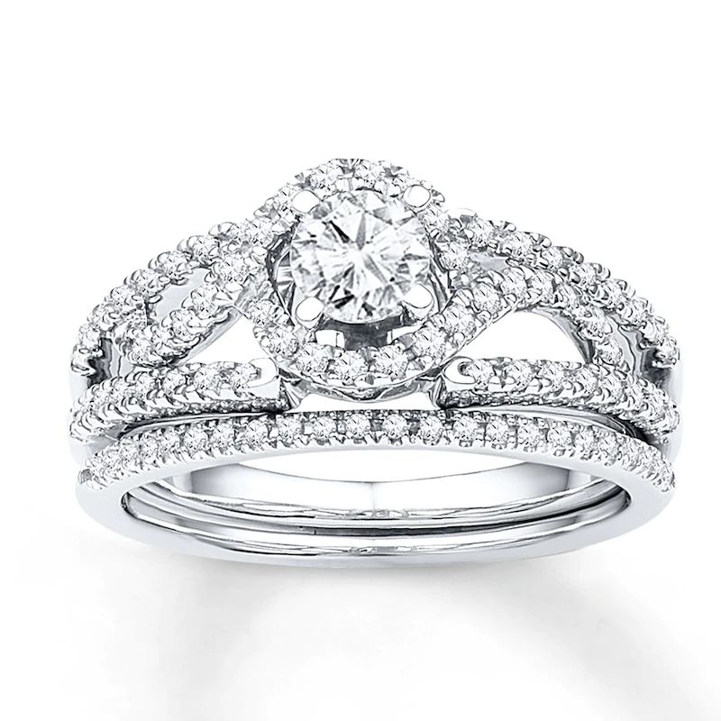 This fabulous bridal set for her features a round diamond enveloped in swirls of additional round diamonds at the center of the engagement ring. More round diamonds edge the 10K white gold band of the engagement ring and the matching wedding band. The bridal set has a total diamond weight of 3/4 carat.